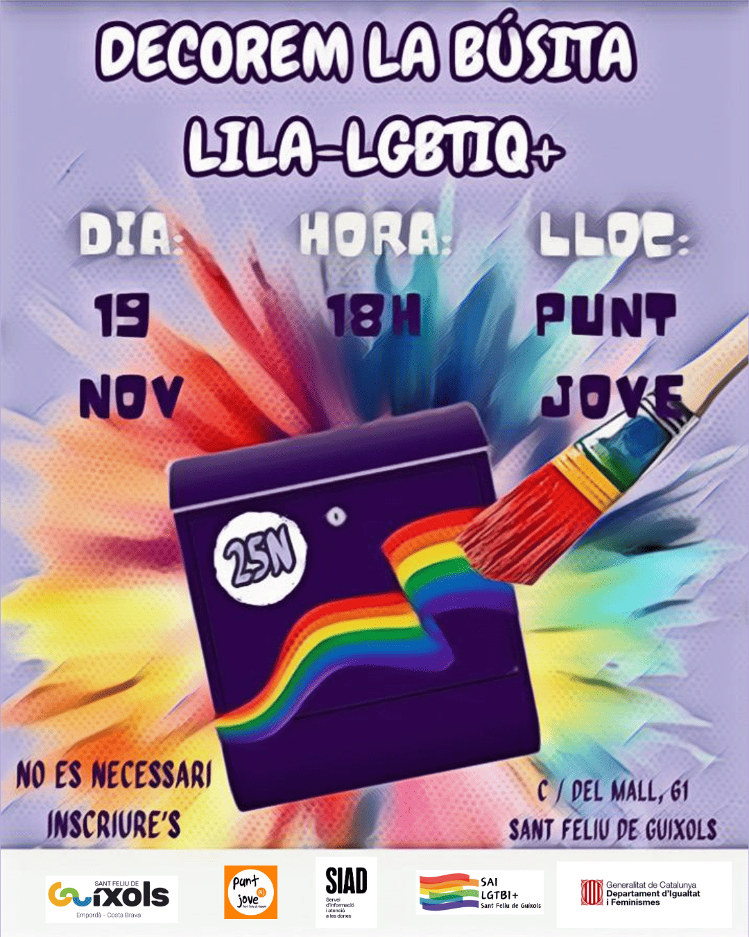 El proper 19 de novembre a les 18 h, el Punt Jove (c/ del Mall, 61) acollirà una activitat oberta a tothom: pintarem i decorarem la bústia lila-LGBTIQ+ amb colors i missatges inclusius.